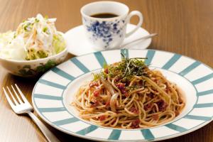 サラダ付き。細かく刻まれた梅をまぶしたスパゲッティ。上には海苔と青じそが載っている。
